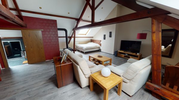 * Une suite parentale de 78 m² au sol comprenant une salle d’eau (meuble vasque, wc, douche), un espace pouvant servir de dressing et un poêle à bois