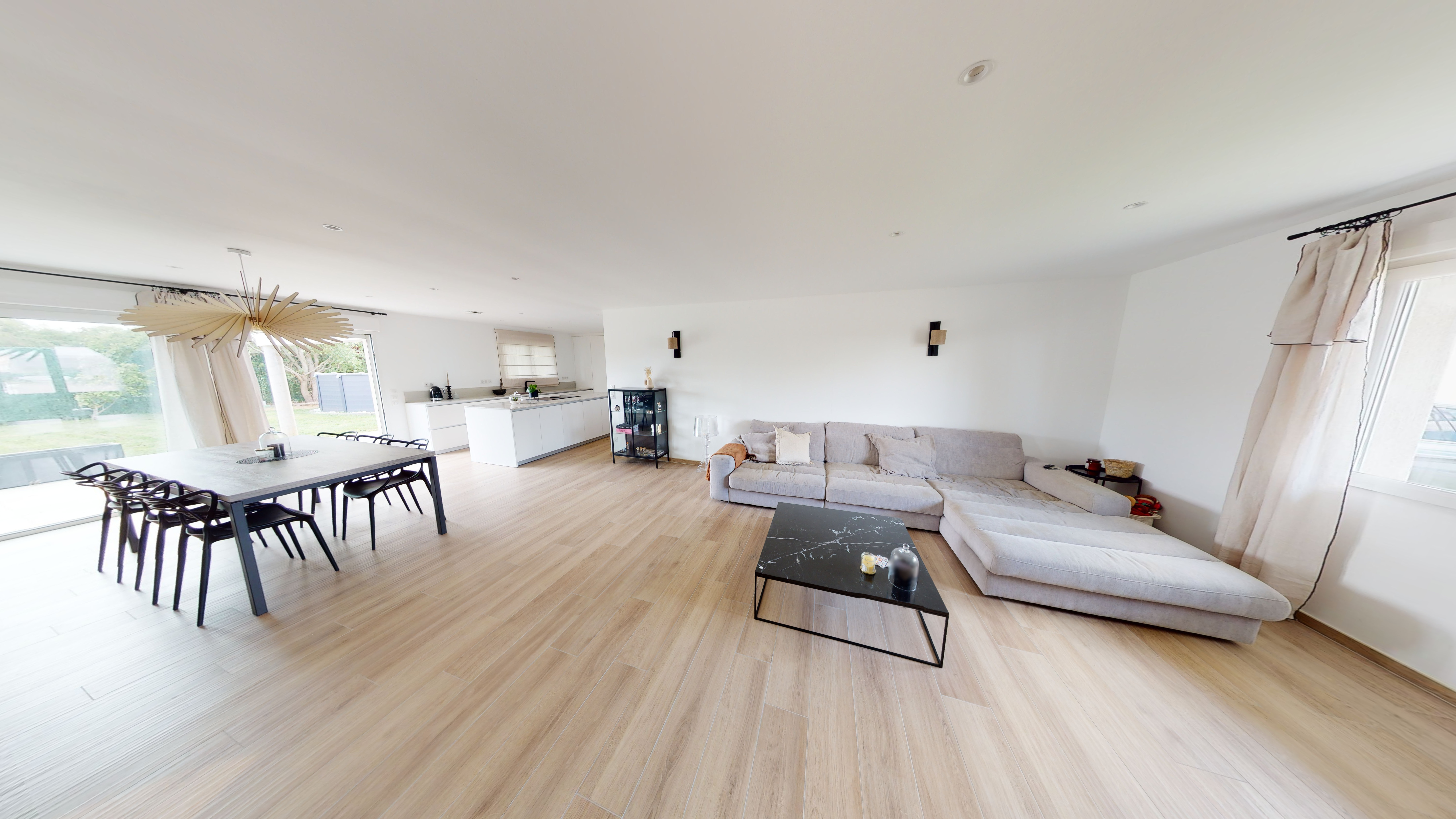 – Une cuisine équipée (four, micro-onde, lave-vaisselle, hotte, plaque de cuisson) ouverte sur salon/salle à manger avec accès terrasse/jardin